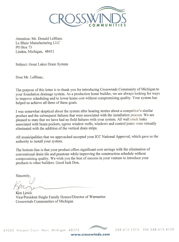 As the Great Lakes Drain System™ product earned the trust of Crosswinds Communities with the installation of the system on hundreds of new foundations.